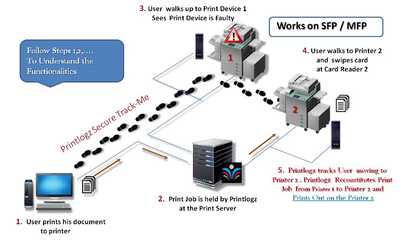 Printlogz Secure Track Me Printing allows Users to fire Print Jobs to a Network Print Queue, Roam and Release their specific Print Job from any enabled print device in the network. This ensures printing is confidential to the user and reduces printed waste as unreleased documents will be deleted from the print queue after set time period. If a printer is Busy / Out of service, Users can Roam the next available printer and release their print jobs there , without disrupting productivity.